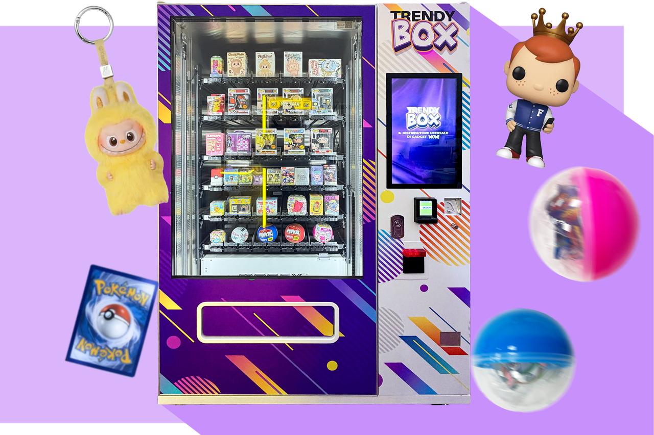 La TRENDY BOX VENDING MACHINE è pensata per intercettare le passioni del momento: gadget, accessori tech, mini prodotti lifestyle e novità ad alta rotazione.